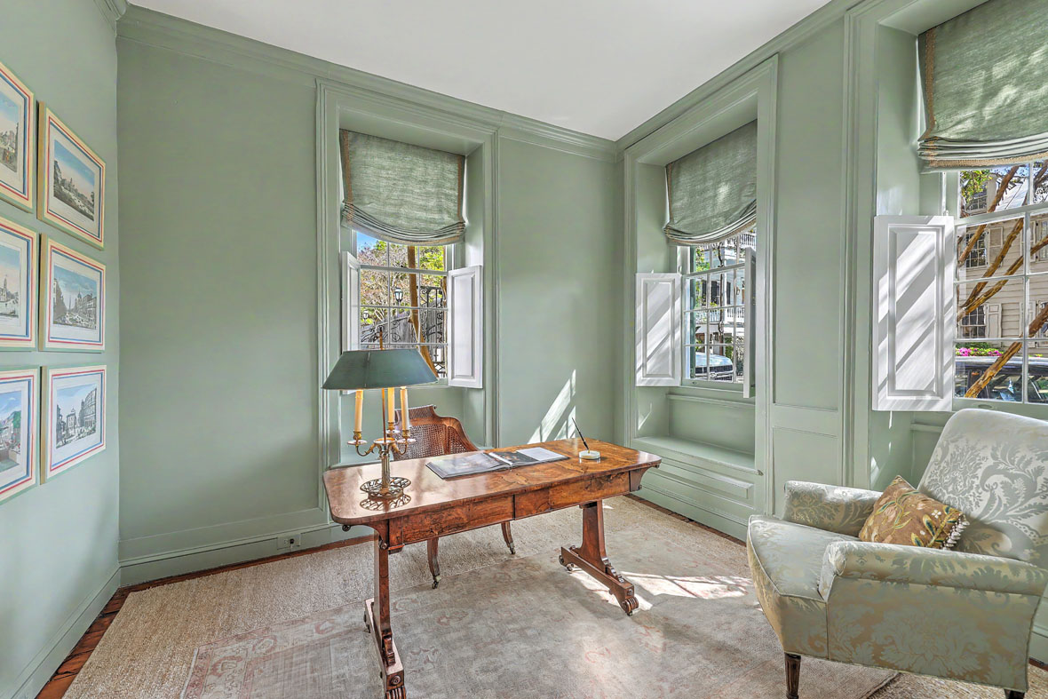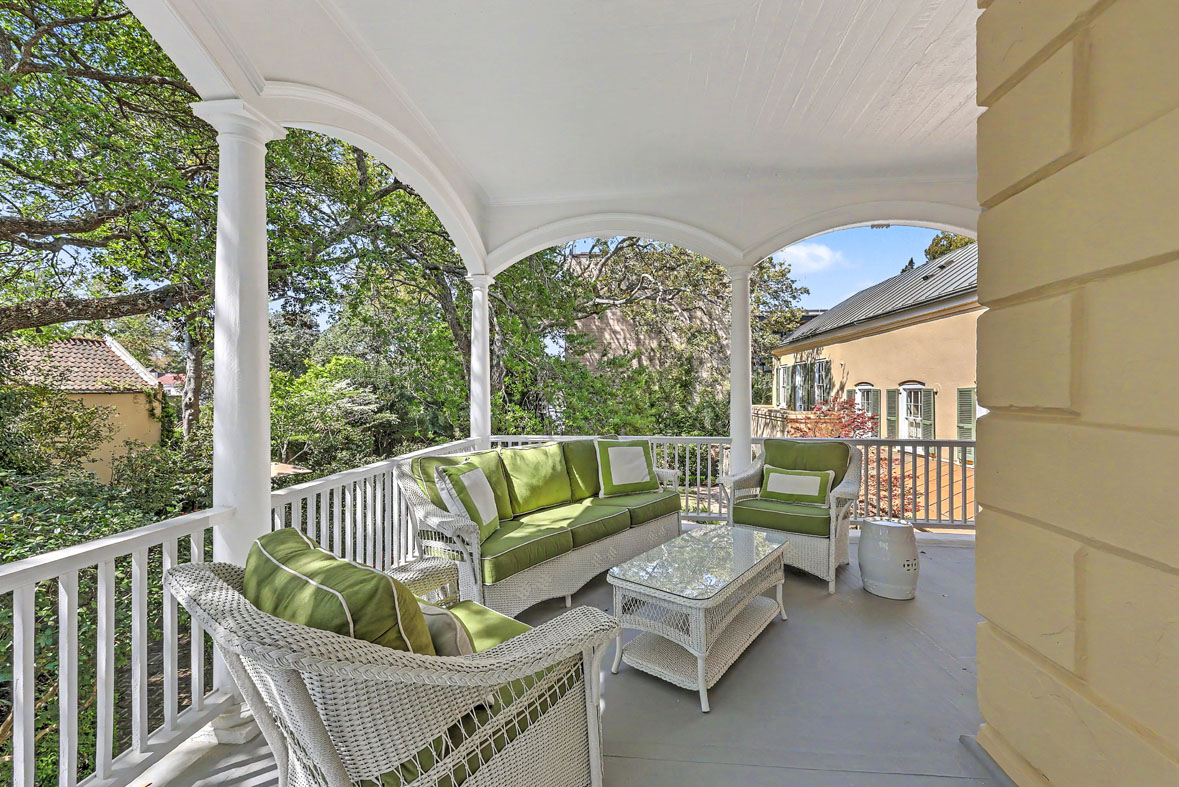 A high stucco and brick wall draped in fig vines encloses the property, creating an extraordinary sense of privacy in the heart of the historic district. The home sits next door to the First Baptist Church of Charleston, providing an exceptional view of its columned portico from the stair hall Palladian window. The church was founded in 1682 as the first in the South and the present structure was built by Robert Mills in 1822. Residents are literally surrounded by history.