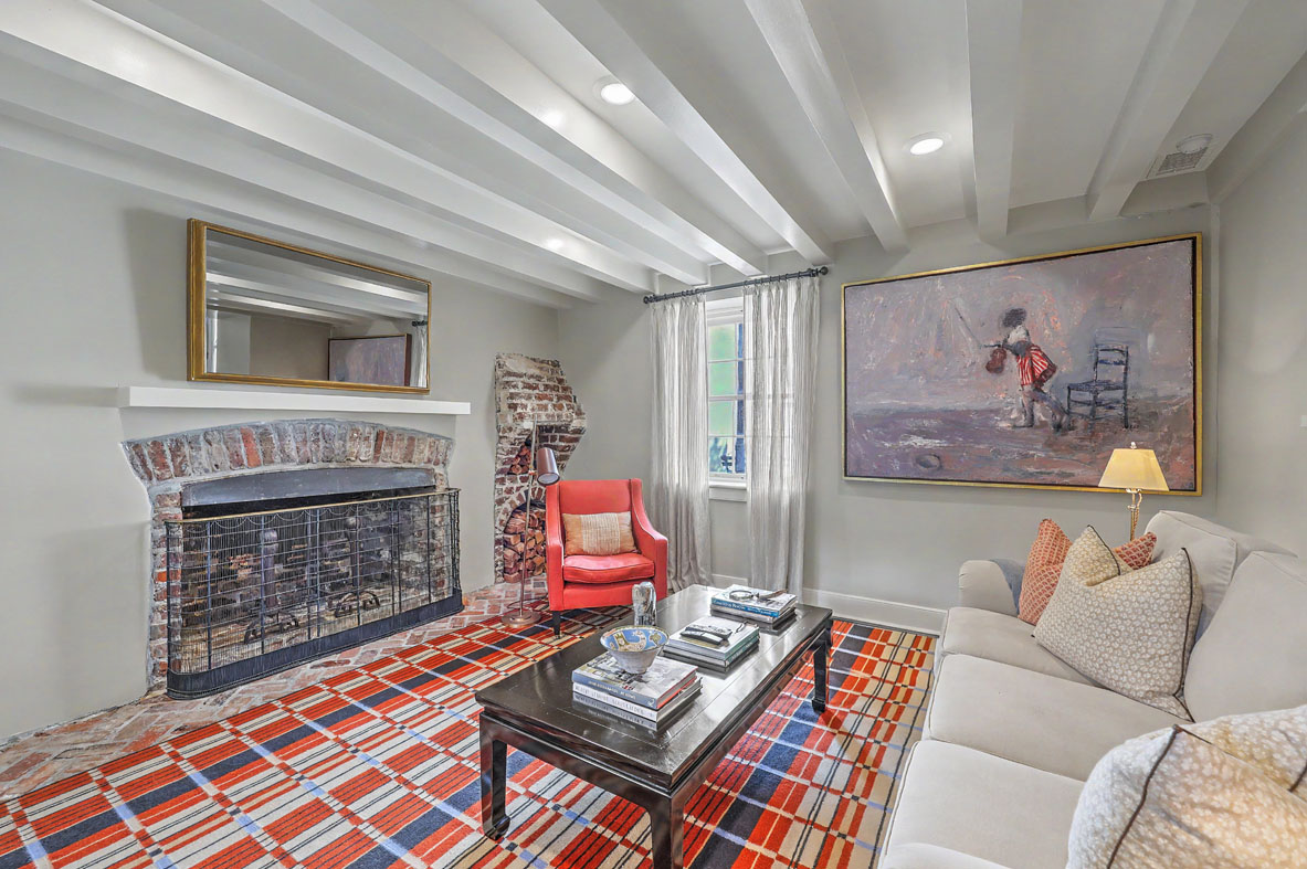 Upstairs (away from the detritus of 18th- and 19th-century streets), the drawing room spans the entire width of the house—believed to be the earliest surviving example of this layout in Charleston. It expresses the grand scale typical of Georgian buildings, with tall ceilings, large recessed windows, rich cypress paneling, crown molding, arched doors, and a china cabinet. The delicate Adams-style mantel dates to the early 19th century. (When the fireplace was recently restored, the owners found 6 blue Delft tiles from the earlier surround. These are now incorporated into the backsplash behind the kitchen range.) A jib door beneath the frontmost window allows access to the second-story breezy piazza.