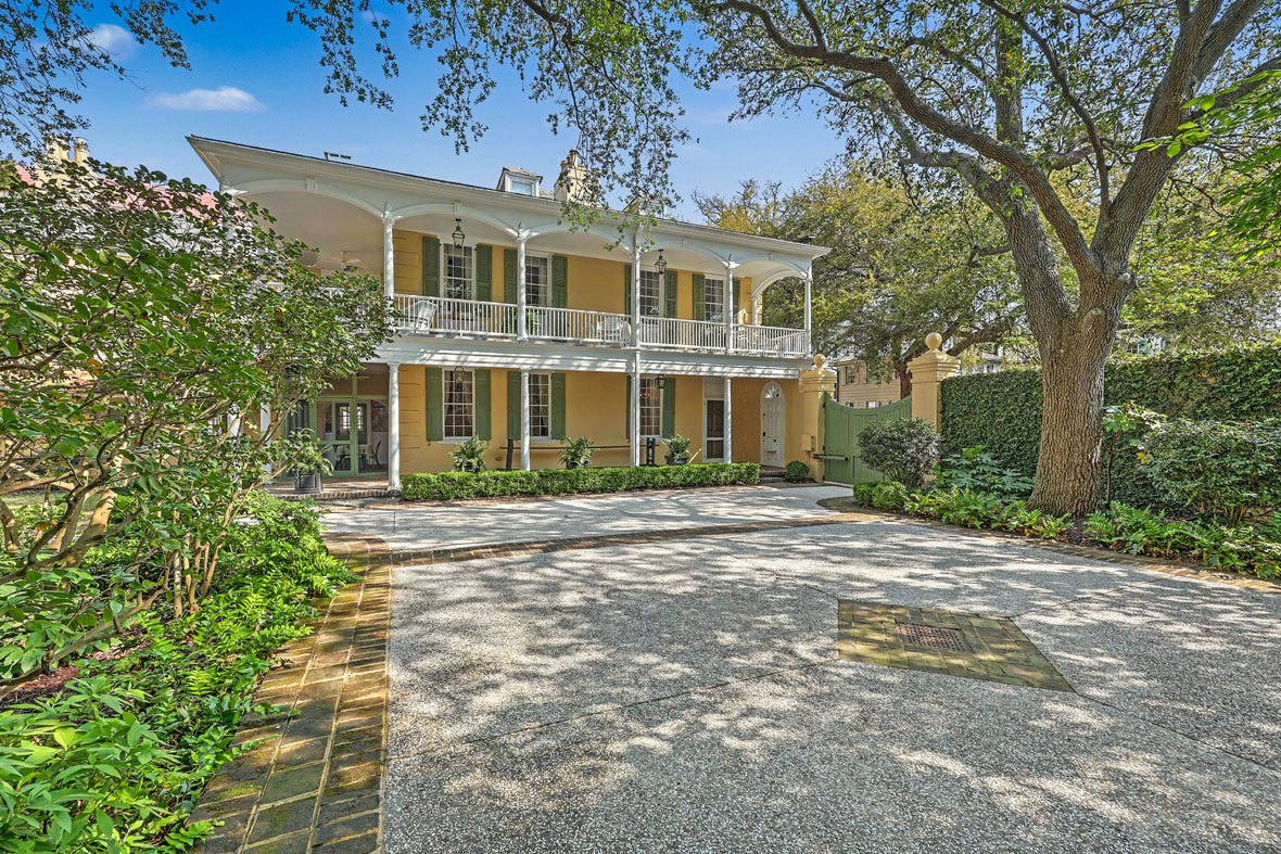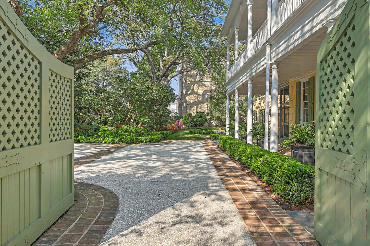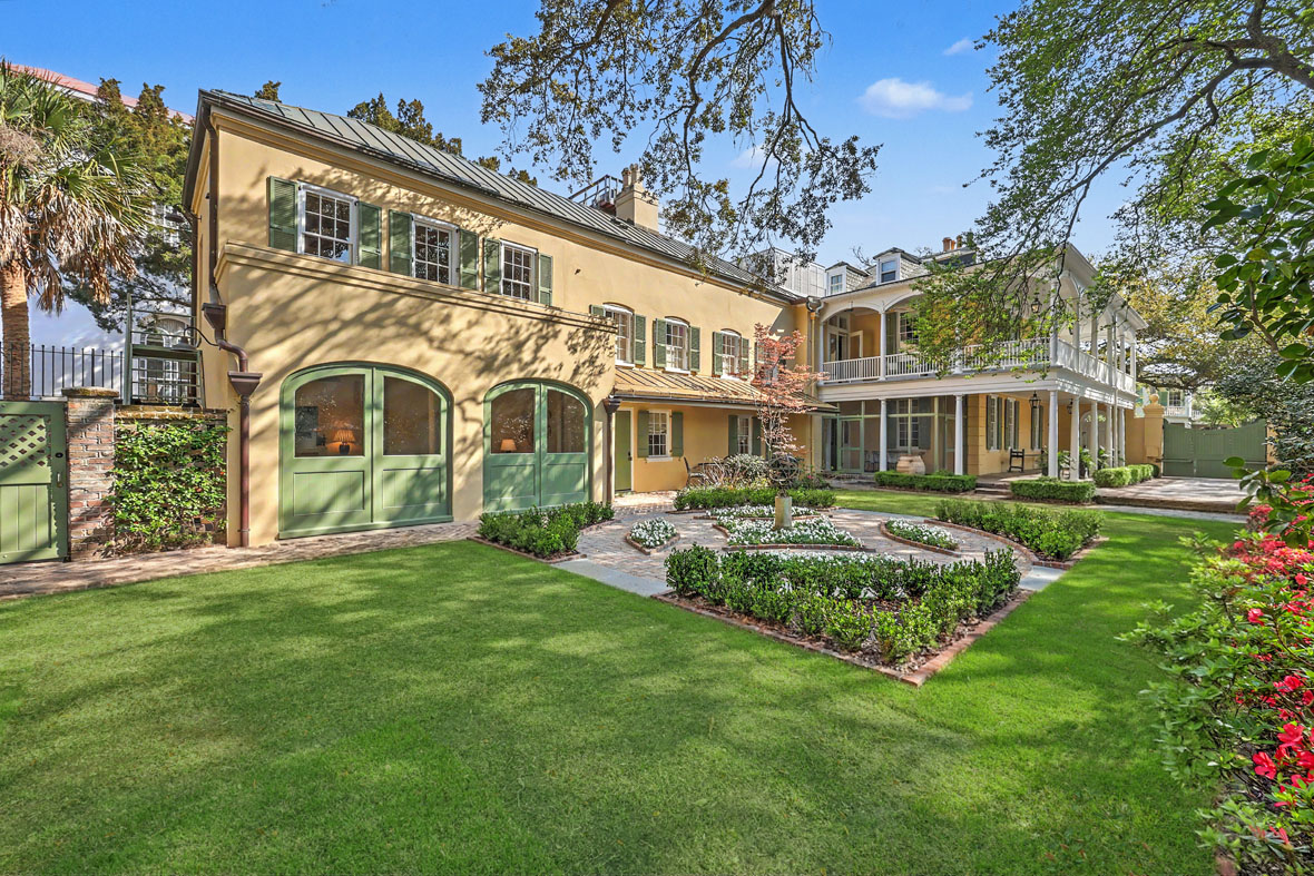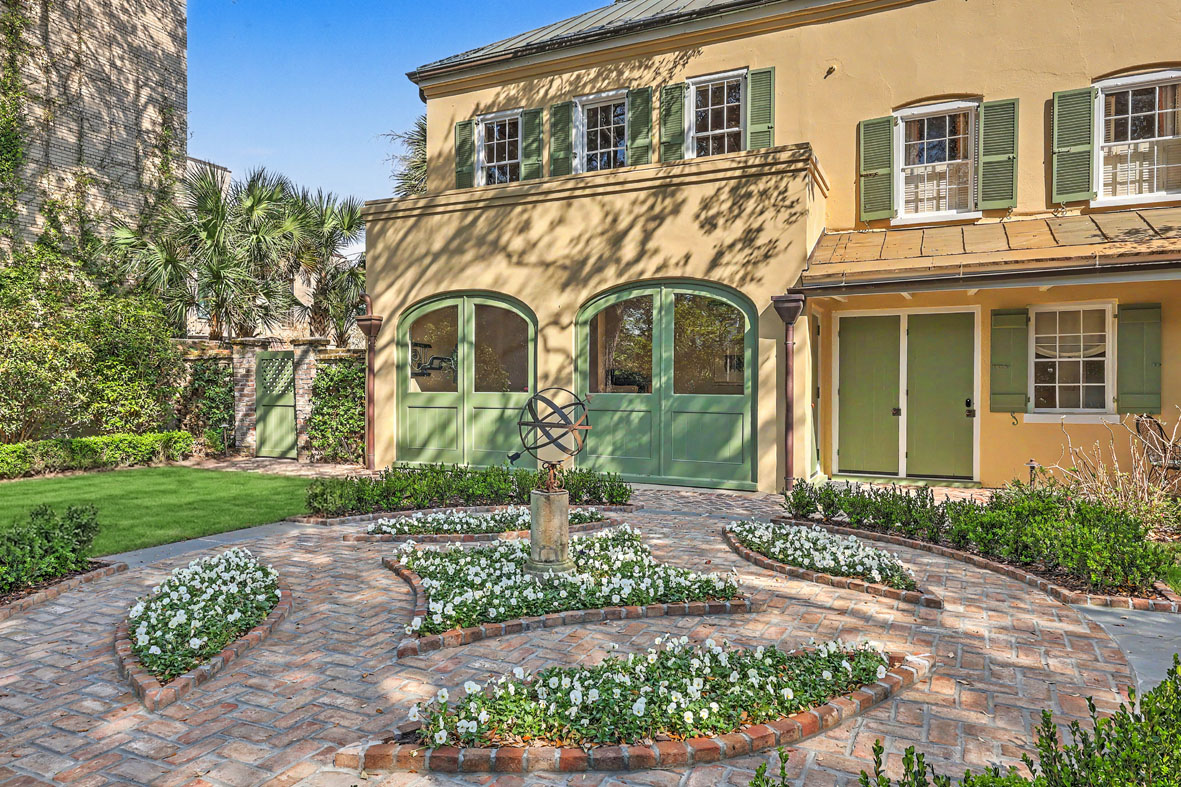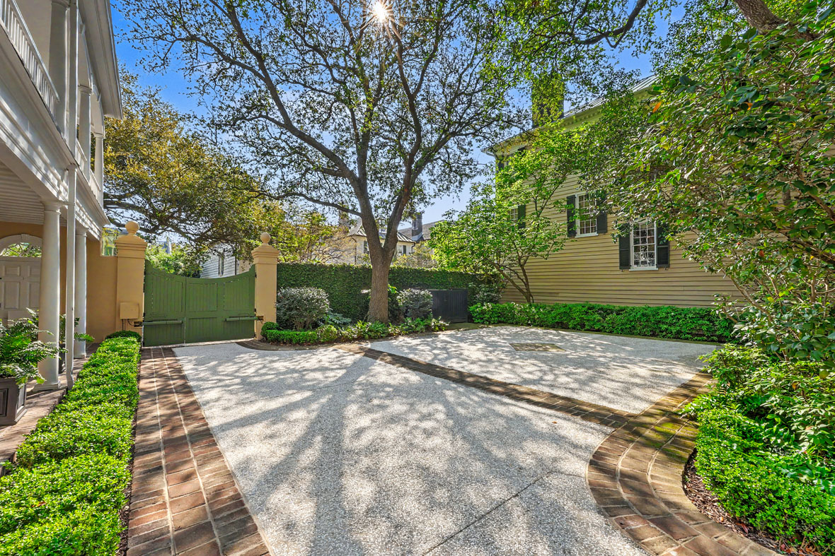 A large brick and stucco parking court behind an automatic mahogany gate provides convenient off-street parking for multiple vehicles, while copper gutters, interior and exterior shutters, and beautifully preserved architectural details complete this exceptional Charleston estate.