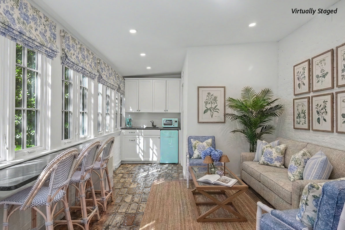 Guest accommodations are thoughtfully arranged to provide both comfort and privacy. The original carriage house has been transformed into a guest suite with sitting, dining, and sleeping areas, along with a breakfast bar and a full bath. The original carriage doors are preserved as large windows that flood the interior with light and frame views of blooming azaleas in the garden beyond. Automatic shades ensure restful nights for visiting family and friends.